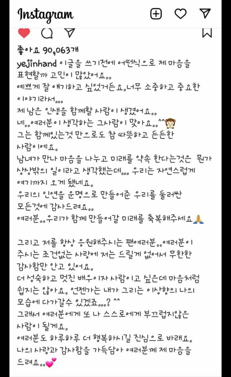 방금 발표한 따끈따끈한 손예진님의 인스타그램을 살펴볼까요..